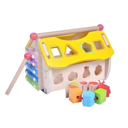 Esta casa cuenta con 7 modos de juego: cordón de frutas de madera, xilófono, reloj, anillos de madera, engranajes, clasificador de formas y es desmontable.