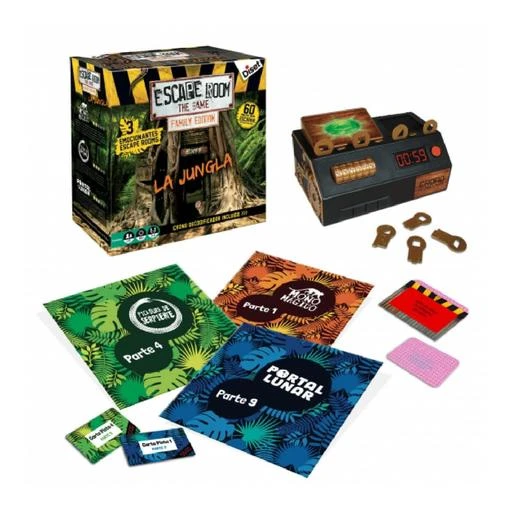 Es un juego de mesa que simula una experiencia Escape Room de verdad. Con 3 aventuras tematizadas en la jungla: Mono mágico, Picadura de serpiente y Portal lunar.