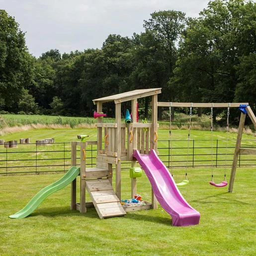 La torre infantil Cascade con columpio doble incluye las maderas, los asientos del columpio (2 asientos de plástico y cuerdas), una rampa de tobogán de 1,20 m de altura, los anclajes para fijarlos en un suelo blando de tierra o césped, los tapones de perno, las manijas y las instrucciones de montaje. Los accesorios como los prismáticos, el timón, el telescópio, la rampa de tobogán 0,90 m altura, espejo mágico, etc no vienen incluidos.
