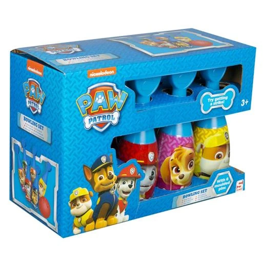 Coloca los 6 bolos con la imagen de los personajes de la Patrulla Canina sobre una superficie plana y lanza la pelota.
